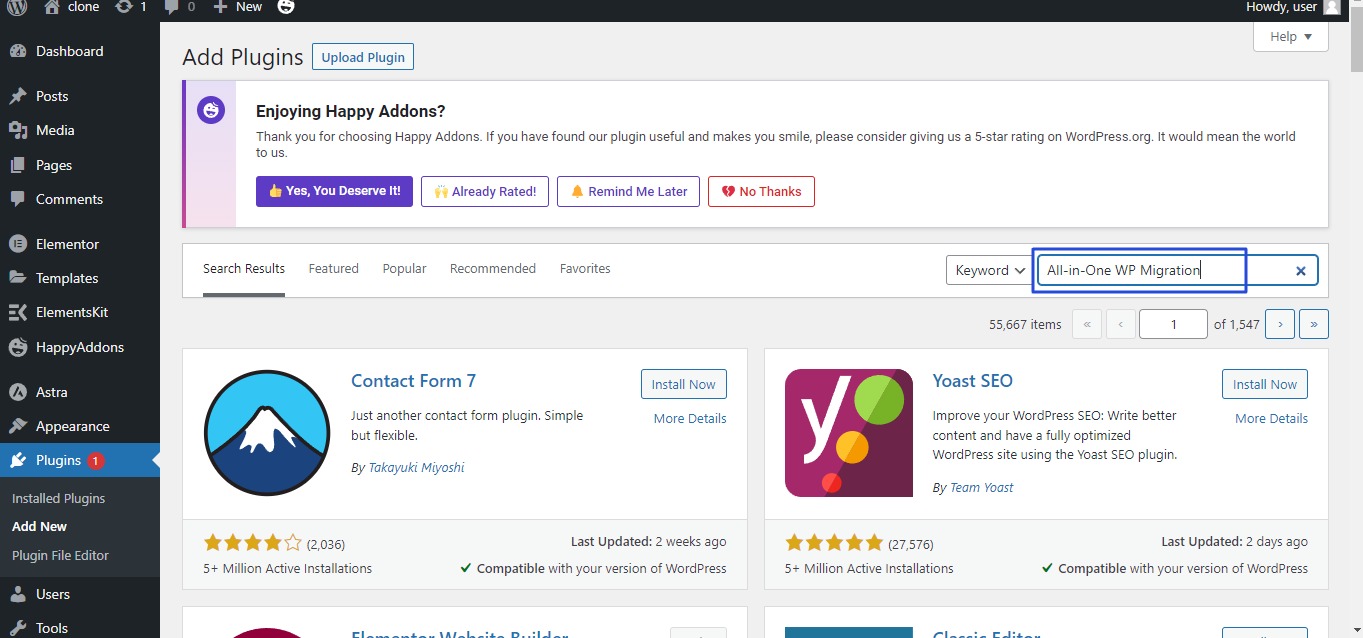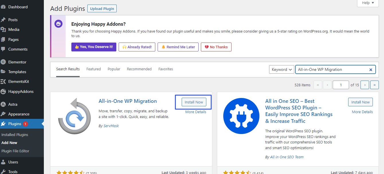 • New list will appear, write  All-in-One WP Migration  in search area As in the following image