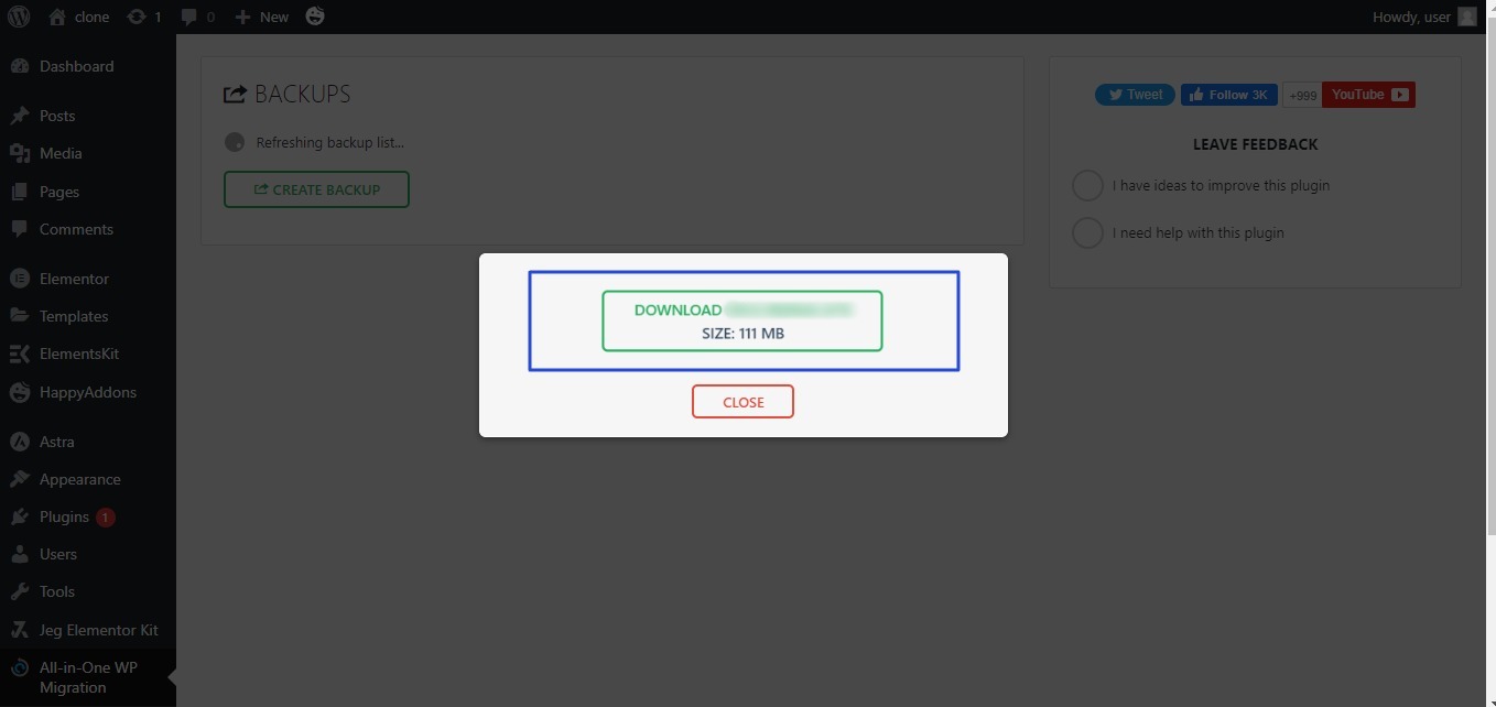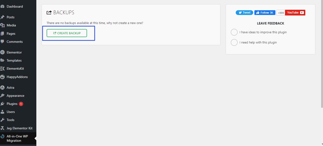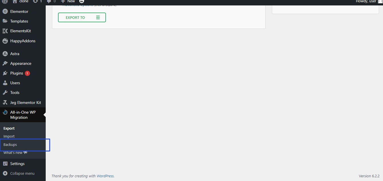 • All-in-One WP Migration plugin will now appear on the side bar, click  Backups As in the following image