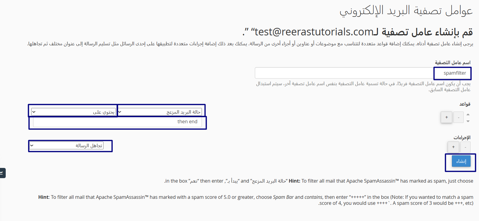 - ستظهر لك قائمه جديده قم بادخال اسم عامل التصفيه ونوعه ومحتواه ثم اضغط علي زر إنشاء ، كما في الصوره التاليه